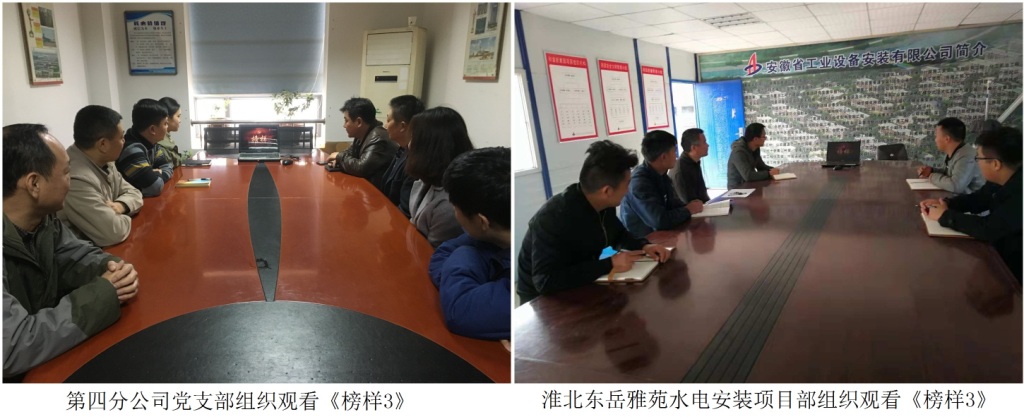 為深入學(xué)習(xí)貫徹習(xí)近平新時(shí)代中國(guó)特色社會(huì)主義思想和黨的十九大精神,深入推進(jìn)“兩學(xué)一做”學(xué)習(xí)教育常態(tài)化制度化,樹(shù)立優(yōu)秀共產(chǎn)黨員楷模,發(fā)揮先進(jìn)典型示范作用,按照《中共安徽省委組織部關(guān)于認(rèn)真做好<榜樣3>專題節(jié)目學(xué)習(xí)宣傳工作的通知》要求,近日,安徽安裝公司組織各黨支部、項(xiàng)目部黨員干部職工集中觀看《榜樣3》專題節(jié)目。