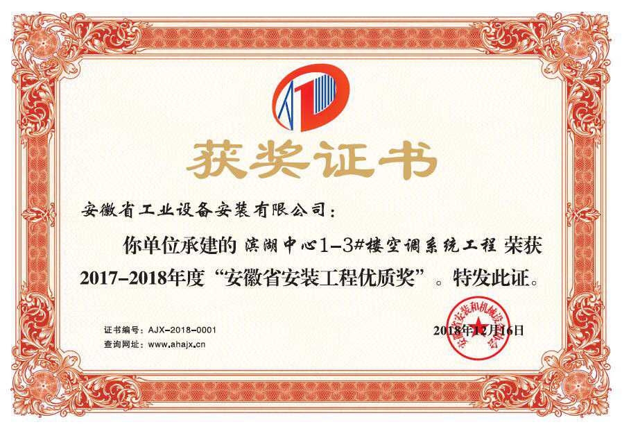 根據(jù)《中國安裝工程優(yōu)質(zhì)獎(中國安裝之星)評選辦法》(安協(xié)〔2015〕19號)、《關于開展“2017-2018 年度中國安裝工程優(yōu)質(zhì)獎(中國安裝之星)第一批評選活動”的通知》(安協(xié)〔2017〕7 號)要求,協(xié)會做為我省推薦單位,組織專家對七個申報中國安裝工程優(yōu)質(zhì)獎項目,進行檢查驗收,一致認為,均代表我省安裝行業(yè)優(yōu)質(zhì)水平。為表彰先進,樹立標桿,經(jīng)研究決定授予安徽省工業(yè)設備安裝有限公司“濱湖中心1-3#樓空調(diào)系統(tǒng)工程”等七項工程榮獲2017-2018年度“安徽省安裝工程優(yōu)質(zhì)獎”。并在協(xié)會第七屆三次理事(擴大)會議上通報表彰。協(xié)會希望各獲獎單位珍惜榮譽,再接再厲,繼續(xù)探索爭先創(chuàng)優(yōu)的經(jīng)驗,充分發(fā)揮示范引領作用,各協(xié)會會員單位要以獲獎單位為榜樣,牢固樹立質(zhì)量第一意識,多出精品,多創(chuàng)名品,為質(zhì)量強省,提質(zhì)優(yōu)效,轉型升級發(fā)展而努力。