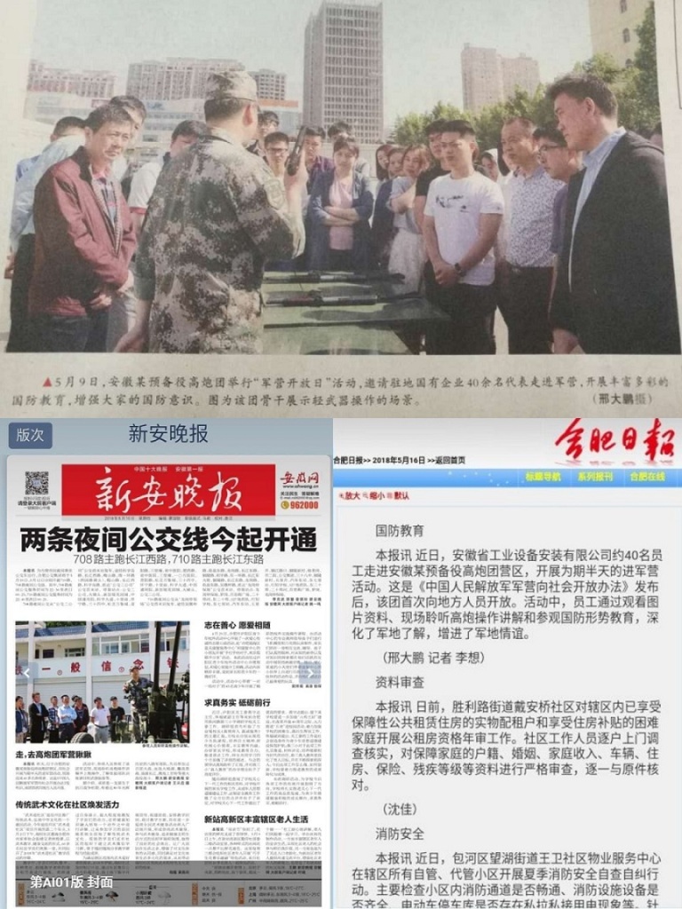 自5月9日安徽安裝公司組織開展赴安徽預(yù)備役師高炮團(tuán)營(yíng)區(qū)開展“走進(jìn)軍營(yíng)·感受軍魂”愛國(guó)主義教育實(shí)踐活動(dòng)以來(lái),合肥日?qǐng)?bào)、新安晚報(bào)、人民陸軍報(bào)等多家媒體對(duì)此活動(dòng)進(jìn)行了報(bào)道。