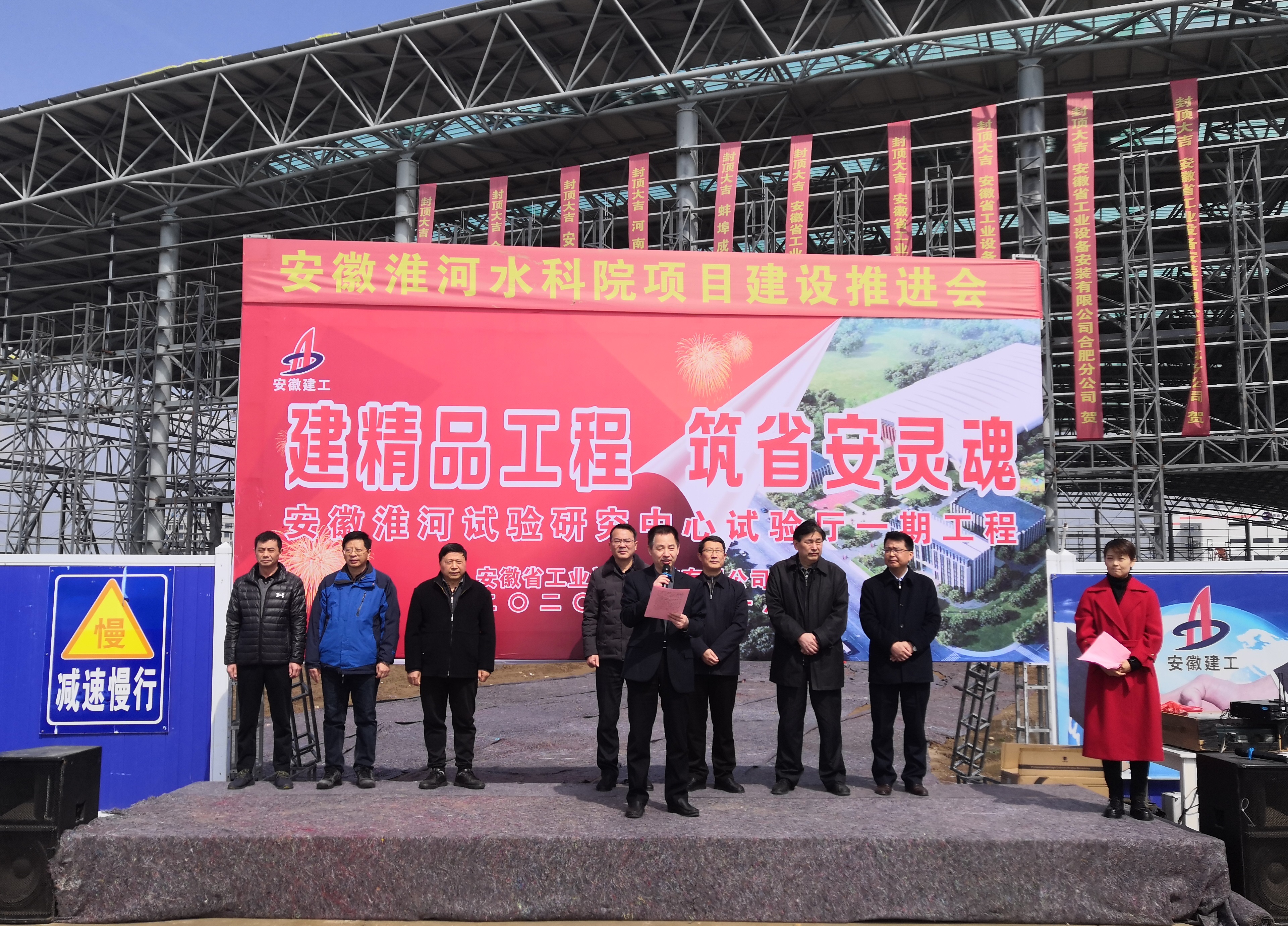 儀式現(xiàn)場(chǎng),胡六中表示:安徽安裝始終秉承“創(chuàng)造空間藝術(shù)、成就人文生活”的企業(yè)使命,踐行“誠(chéng)信為本、敬業(yè)至上”的企業(yè)核心價(jià)值觀,發(fā)揚(yáng)“團(tuán)結(jié)、拼搏、求實(shí)、創(chuàng)新”的企業(yè)精神,為社會(huì)各界客戶建設(shè)出一個(gè)又一個(gè)優(yōu)良工程。安徽省淮委水科院淮河試驗(yàn)廳一期工程在參建各方人員的大力支持下,項(xiàng)目部堅(jiān)持高標(biāo)準(zhǔn)、嚴(yán)要求,精心組織施工,科學(xué)安排生產(chǎn),從項(xiàng)目開(kāi)工就鼓足干勁,日夜兼程,精心組織,精心施工,搶晴天、拼雨天、頂烈日、抗酷暑、戰(zhàn)嚴(yán)冬、抗疫情,從最初172根長(zhǎng)螺旋鉆孔樁樁基的施工,到成千噸鋼材切割、下料、拼裝、焊接,最后一排排鋼柱高高吊起,一榀榀桁架凌空對(duì)接,項(xiàng)目克服了難以盡述的困難和挫折。幾度耕耘,幾度風(fēng)雨,幾番磨礪,幾番拼搏,順利實(shí)現(xiàn)主體結(jié)構(gòu)封頂,取得了工程建設(shè)的階段性勝利。在后期的施工中,安徽安裝公司及項(xiàng)目部全體人員將以此為契機(jī),再接再厲,繼續(xù)發(fā)揚(yáng)“特別能吃苦,特別能戰(zhàn)斗”的優(yōu)良作風(fēng),一手抓生產(chǎn),一手抓防疫,全力以赴完成好后續(xù)各項(xiàng)工作,嚴(yán)格施工管理,急業(yè)主所急,想業(yè)主所想,全面抓好工程質(zhì)量、安全、進(jìn)度,保質(zhì)保量履行好合同義務(wù),確保工程如期完工,盡心竭力把項(xiàng)目打造成為“優(yōu)質(zhì)精品工程、業(yè)主滿意工程”,為珠城建設(shè)貢獻(xiàn)出一份力量。