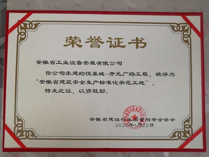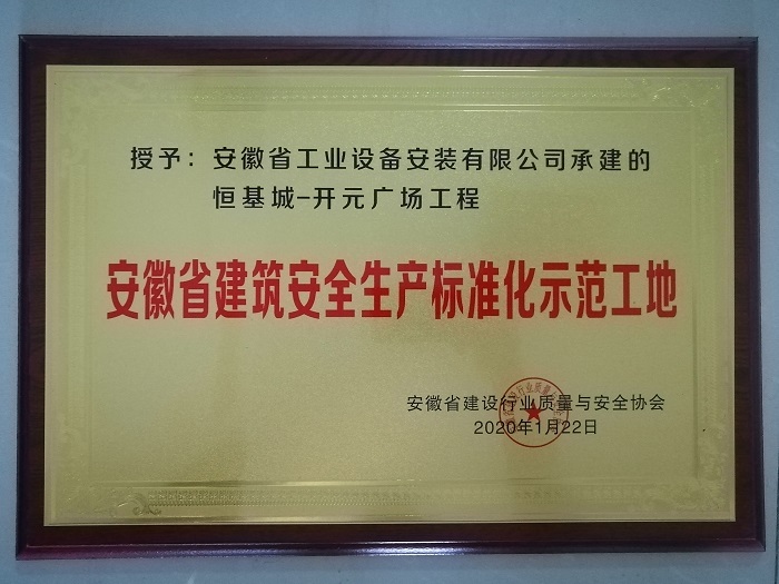 近日,安徽安裝承建的淮北恒基城開元廣場項(xiàng)目榮獲“安徽省建筑安全生產(chǎn)標(biāo)準(zhǔn)化示范工地”稱號,為公司在安全生產(chǎn)方面樹立了良好的企業(yè)形象。