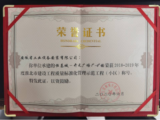 近日,安徽安裝公司承建的淮北恒基城開元廣場項目工程榮獲“2018--2019年度淮北市建設(shè)工程質(zhì)量標(biāo)準(zhǔn)化管理示范工程(小區(qū))”稱號。