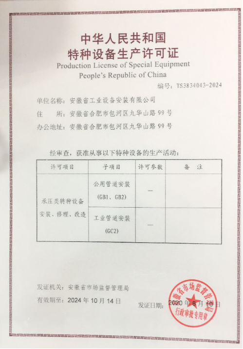 近日,安徽安裝公司壓力管道(GC2、GB1、GB2)安裝維修許可換證評審順利通過。