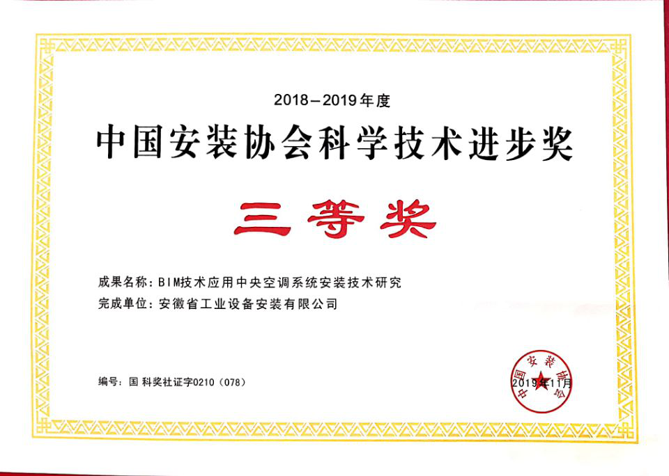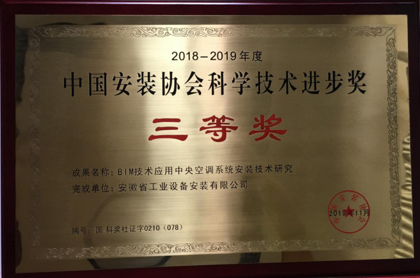 由安徽安裝公司主持研究的《BIM技術(shù)應(yīng)用中央空調(diào)系統(tǒng)安裝技術(shù)研究》項目榮獲“2018-2019中國安裝協(xié)會科學(xué)技術(shù)進步獎”三等獎榮譽。受疫情影響,該獎牌及證書于8月15日下發(fā)。