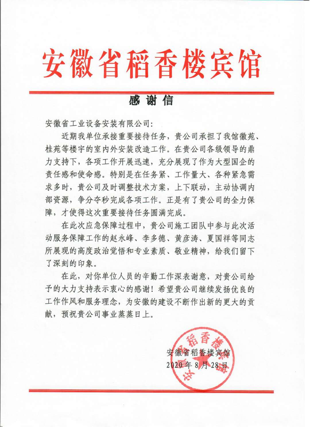 為此,稻香樓賓館發(fā)來的一封感謝信,感謝安徽安裝公司在近期承擔的稻香樓賓館室內(nèi)外安裝改造工程任務(wù)中,啟動迅速、保障有力、方案得當、上下聯(lián)動;通過日夜搶工奮戰(zhàn),爭分奪秒地完成各項工作,充分發(fā)揮國企擔當?shù)闹厝巍?/span>