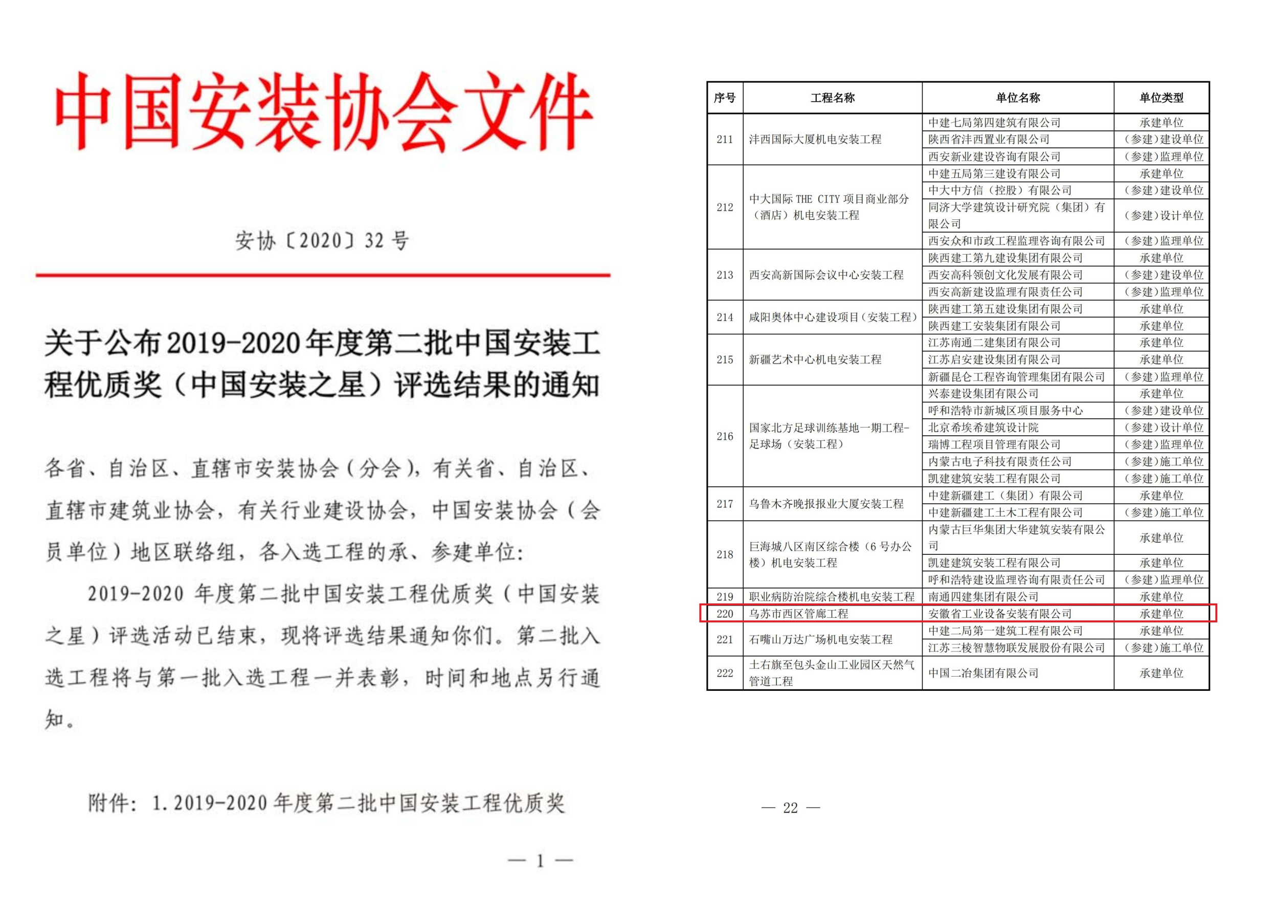 12月10日,經(jīng)中國(guó)安裝協(xié)會(huì)評(píng)選,由安徽安裝公司承建的新疆烏蘇市西區(qū)管廊工程成功獲得中國(guó)安裝工程優(yōu)質(zhì)獎(jiǎng) (中國(guó)安裝之星),這也是我公司首獲的工業(yè)設(shè)備安裝類(lèi)中國(guó)安裝工程優(yōu)質(zhì)獎(jiǎng)。