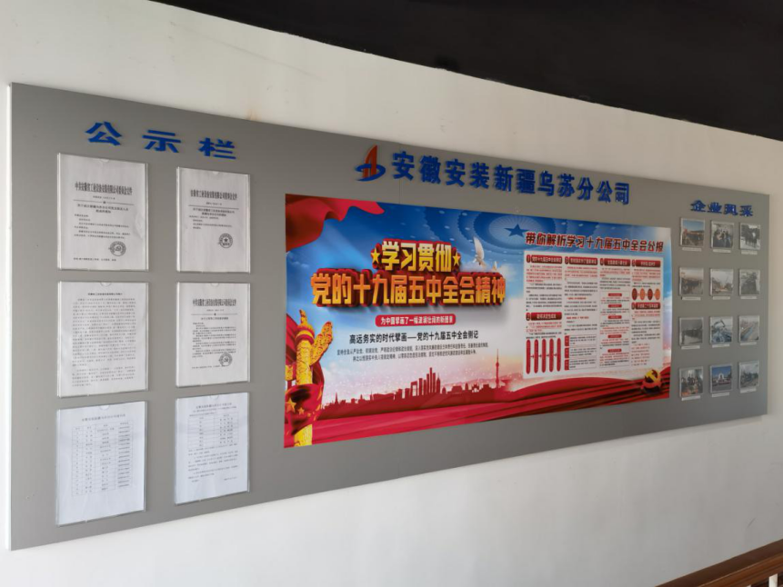走進(jìn)安徽安裝公司新疆烏蘇分公司辦公區(qū),一塊紅色的黨建公開(kāi)欄首先映入眼簾。公開(kāi)欄還包括黨員風(fēng)采、公示欄、黨務(wù)公開(kāi)、光榮榜等板塊,成為分公司一處醒目的景觀。