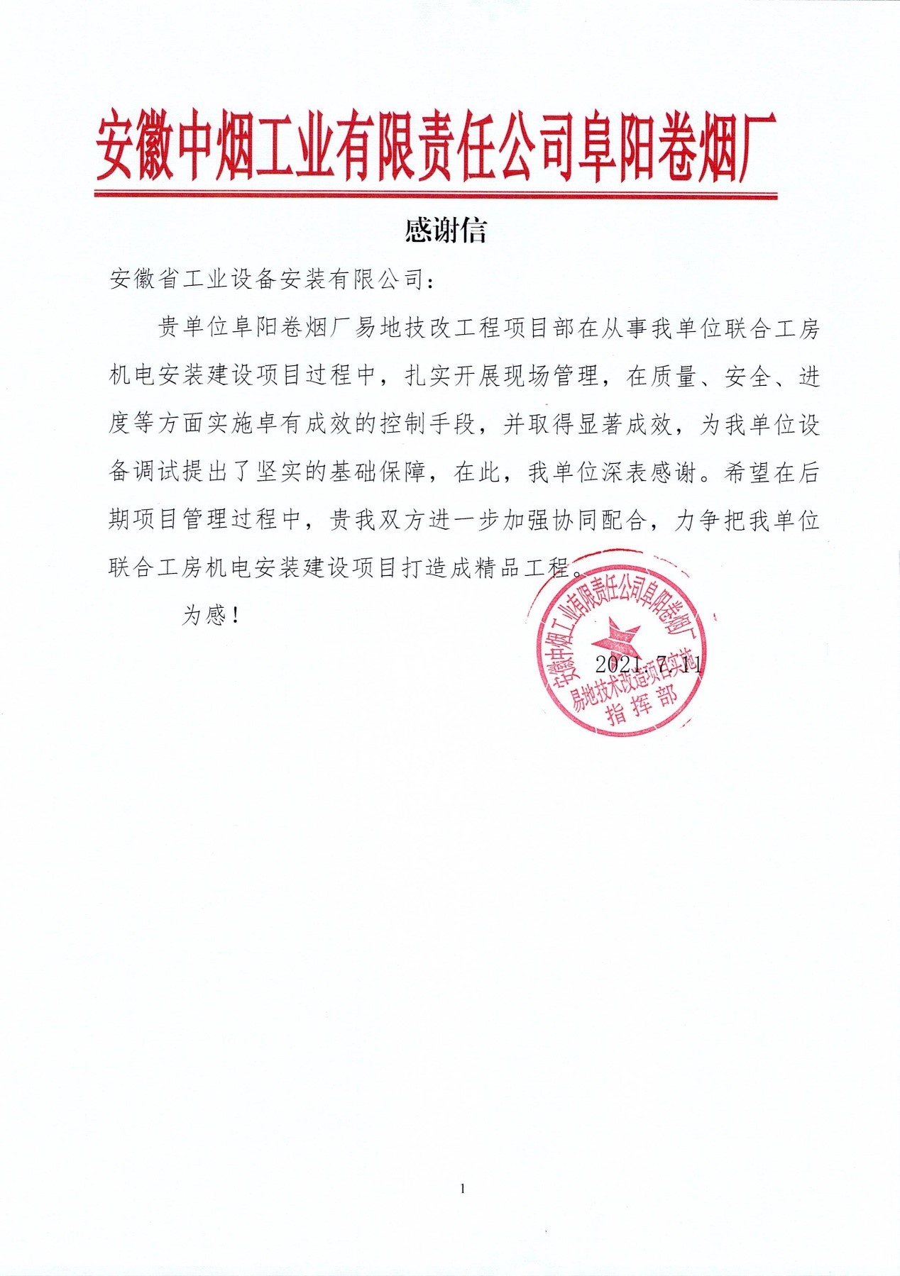 7月11日下午,安徽安裝蚌埠分公司收到安徽中煙阜陽(yáng)卷煙廠發(fā)來(lái)的感謝信。信中對(duì)安徽安裝蚌埠分公司承建的聯(lián)合工房機(jī)電安裝項(xiàng)目表達(dá)了充分認(rèn)可和高度贊譽(yù)。