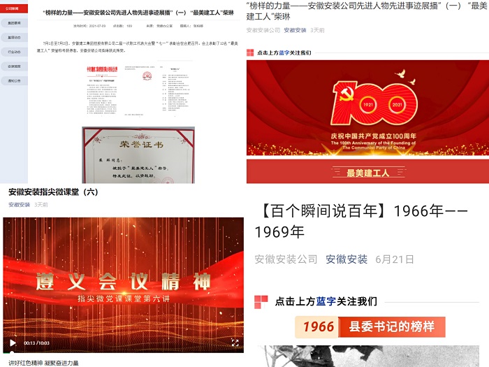 指尖微黨課課堂。為慶祝建黨100周年,促進黨史學(xué)習(xí)教育方式多樣化,讓廣大基層一線黨員尤其是青年黨員同志廣泛參與到黨史宣講中來,公司黨委依托公司官方微信公眾號重新打造安徽安裝的黨課品牌——“指尖微黨課”課堂,組織開展了“講好紅色精神 凝聚奮進力量”指尖微黨課活動。所屬各黨支部積極推薦黨員同志,尤其是基層一線的黨員同志參與到公司黨委“指尖微黨課宣講員”隊伍中來,此次指尖微黨課課堂每集時長5-8分鐘,短小簡潔且內(nèi)涵豐富,以五四精神、紅船精神、井岡山精神、延安精神、航天精神、偉大抗疫精神等人民熔鑄鍛造的偉大紅色精神為主題,講述這些紅色精神背后的感人故事,圍繞每一期紅色精神主題,主講人結(jié)合自身工作實際,談感想談體會。指尖微黨課旨在變“被動學(xué)”為“主動講”,變“集中念開會讀”為“隨時看隨地學(xué)”,解決了公司項目點多面廣,黨員分散不易集中系統(tǒng)學(xué)習(xí)的問題,現(xiàn)在只要打開手機,利用零碎時間就可以通過身邊人的宣講更直觀更生動地領(lǐng)略黨史中的奮進力量,切實做到“人人都是宣講員、黨課揣進口袋中”。