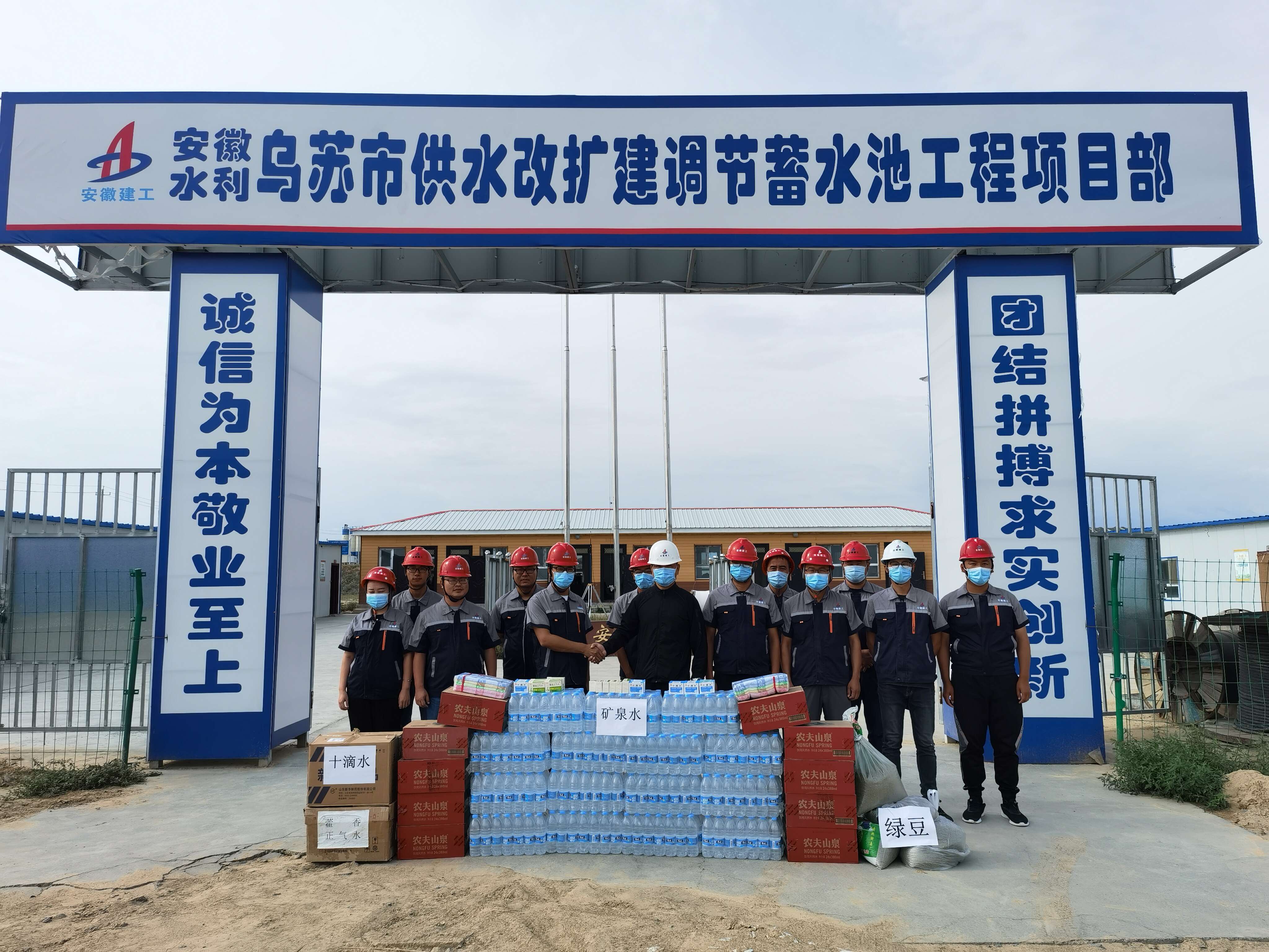 2021年7月14日上午,公司副總經(jīng)理王軍赴烏蘇市供水改擴建調(diào)節(jié)蓄水池項目“送清涼”,將礦泉水、綠豆、冰糖、藿香正氣水、十滴水、毛巾、香皂等防暑降溫物品送到一線員工手中。