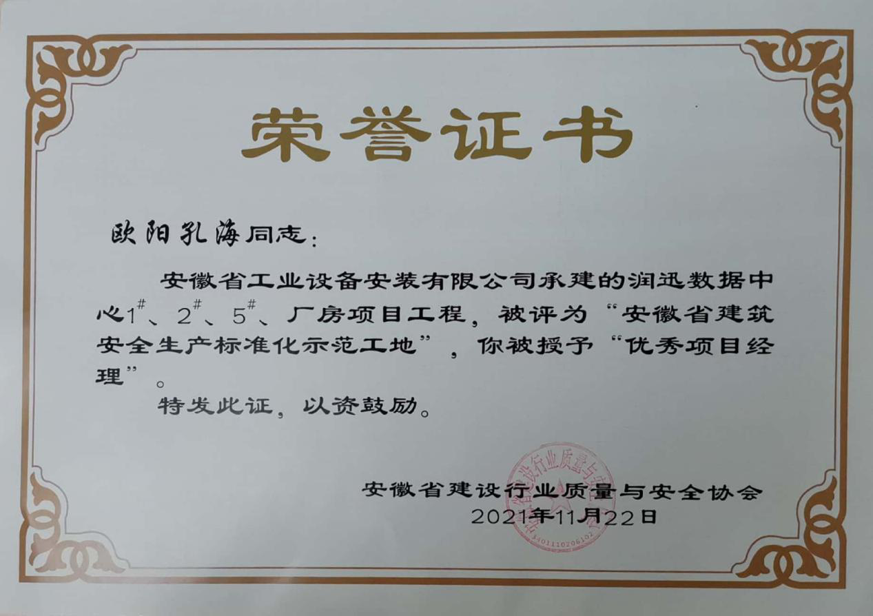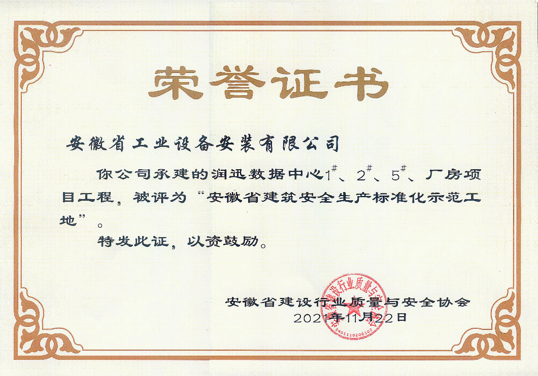 近日,安徽省工業(yè)設備安裝有限公司承建的潤迅數(shù)據(jù)中心1#、2#、5#廠房項目工程榮獲2021年度“安徽省建筑安全生產(chǎn)標準化示范工地”榮譽稱號。