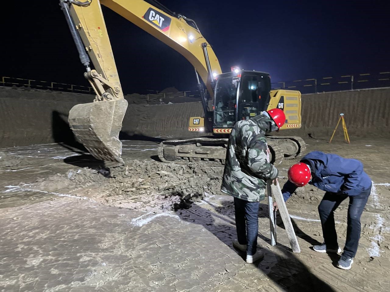 為滿足西動力中心承臺澆筑要求,施工現(xiàn)場燈火通明,項目經(jīng)理徐明東帶領(lǐng)施工員正在認真進行西動力中心承臺基礎(chǔ)測量復(fù)核工作。