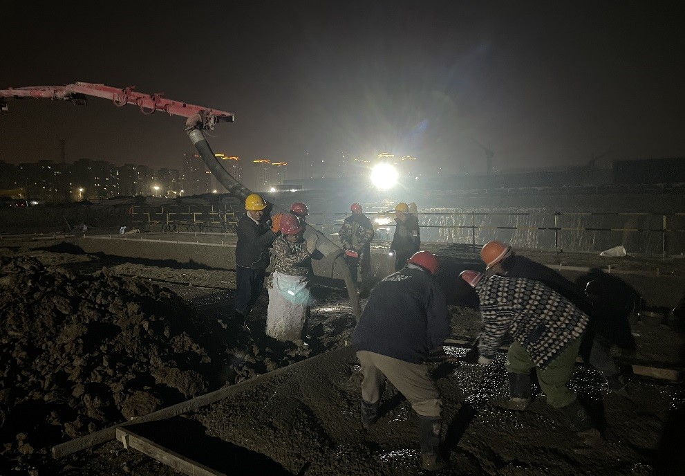 工人師傅們晚上加班加點進行西動力中心基礎(chǔ)墊層澆筑