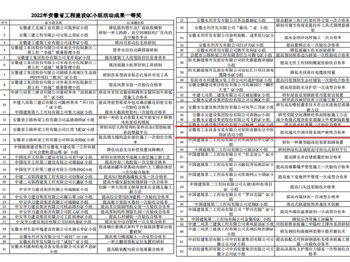 近日,從安徽省建設(shè)行業(yè)質(zhì)量與安全協(xié)會(huì)傳來(lái)喜訊,協(xié)會(huì)發(fā)布的《關(guān)于2022年安徽省工程質(zhì)量管理小組及質(zhì)量信得過(guò)班組建設(shè)活動(dòng)成果的通知》文件中,安徽安裝公司共獲得11項(xiàng)安徽省工程建設(shè)QC小組活動(dòng)成果獎(jiǎng)項(xiàng)。