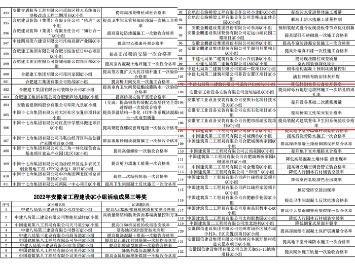 其中安徽安裝公司阜陽(yáng)市潁東區(qū)中醫(yī)院QC活動(dòng)小組完成的《提高通風(fēng)空調(diào)風(fēng)管系統(tǒng)嚴(yán)密性合格率》榮獲2022年安徽省工程建設(shè)QC小組活動(dòng)成果一等獎(jiǎng)。安徽安裝公司安徽省安暖通QC攻關(guān)小組完成的《提高不銹鋼空調(diào)供回水管質(zhì)量合格率》、鋼結(jié)構(gòu)QC小組完成的《提高重型鋼結(jié)構(gòu)廠房雙“H”型鋼柱杯口基礎(chǔ)的安裝精度》等六項(xiàng)課題榮獲2022年安徽省工程建設(shè)QC小組活動(dòng)成果二等獎(jiǎng)。安徽安裝公司公司邊坡鉆孔QC小組完成的《提高碎礫石地層邊坡網(wǎng)施工一次鉆孔的成孔率》、安慶石化項(xiàng)目技術(shù)攻關(guān)QC小組完成的《提升設(shè)備基礎(chǔ)二次灌漿質(zhì)量》等四項(xiàng)課題榮獲2022年安徽省工程建設(shè)QC小組活動(dòng)成果三等獎(jiǎng)。