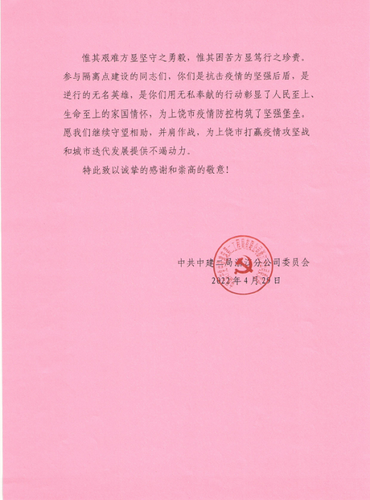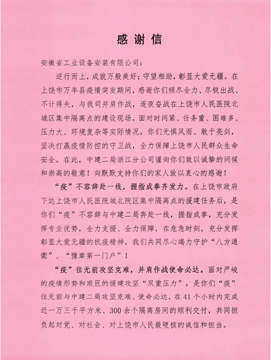 信中對安徽安裝公司與中建二局浙江分公司共同援建上饒市人民醫(yī)院北城區(qū)集中隔離點給予高度的肯定和認可。當前,新冠疫情形勢嚴峻,安徽安裝公司在嚴格落實屬地疫情防控措施的同時,一方面積極參與本地區(qū)隔離點、醫(yī)院發(fā)熱門診的緊急建設任務;另一方面攜手相關行業(yè)兄弟單位同心協(xié)力、援建市外防疫區(qū)域,承擔起國有企業(yè)社會責任,竭盡所能地為防疫建設貢獻最大的力量!