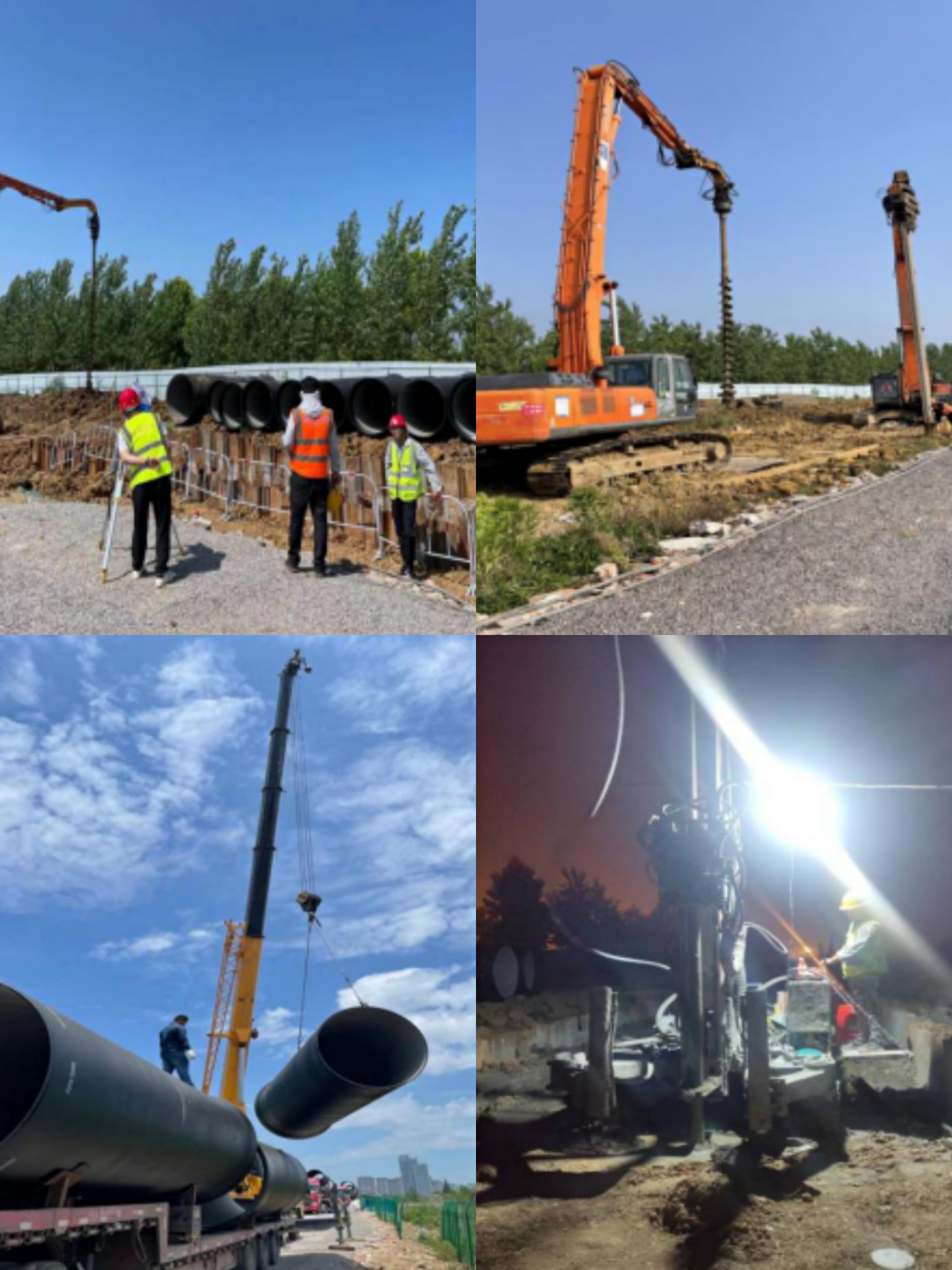 圖為市政分公司四水廠DN1800、DN1400供水管道遷建工程項目現(xiàn)場砂墊層夯實、測量;對球墨鑄鐵管進行吊裝;為搶施工進度夜間施工壓密注漿。