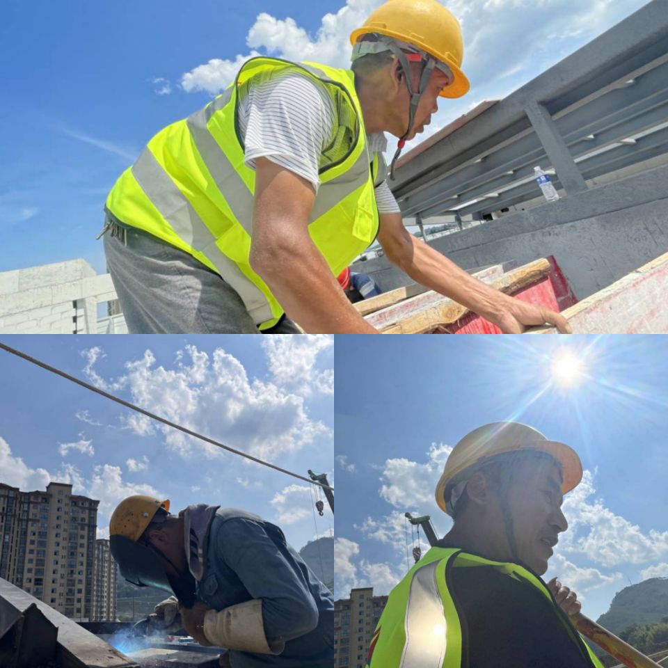 合肥分公司岳西恒泰城項目一線工人頂著38度高溫,揮汗如雨默默奉獻;圖為模板安裝、焊接作業(yè)及混凝土澆筑施工。