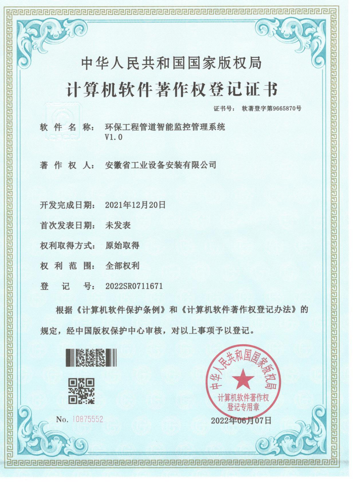 近日,經(jīng)國家版權(quán)局審核批準(zhǔn),安徽安裝公司申報的《環(huán)保工程管道智能監(jiān)控管理系統(tǒng)V1.0》喜獲計算機(jī)軟件著作權(quán)登記證書,這標(biāo)志著公司在數(shù)字與信息化發(fā)展上實現(xiàn)新突破、邁上新臺階,開啟了數(shù)字化轉(zhuǎn)型新征程。