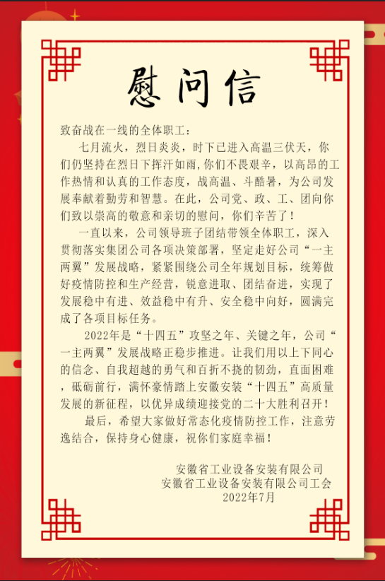 為做好高溫季節(jié)勞動(dòng)保護(hù)和防暑降溫工作,保障高溫天氣始終堅(jiān)持在一線崗位員工的身體健康。7月-8月,安徽安裝公司工會(huì)結(jié)合職工代表巡察,到分公司在建項(xiàng)目開(kāi)展“送清涼”活動(dòng),親切慰問(wèn)施工一線員工,并為他們送去清涼和關(guān)愛(ài)。