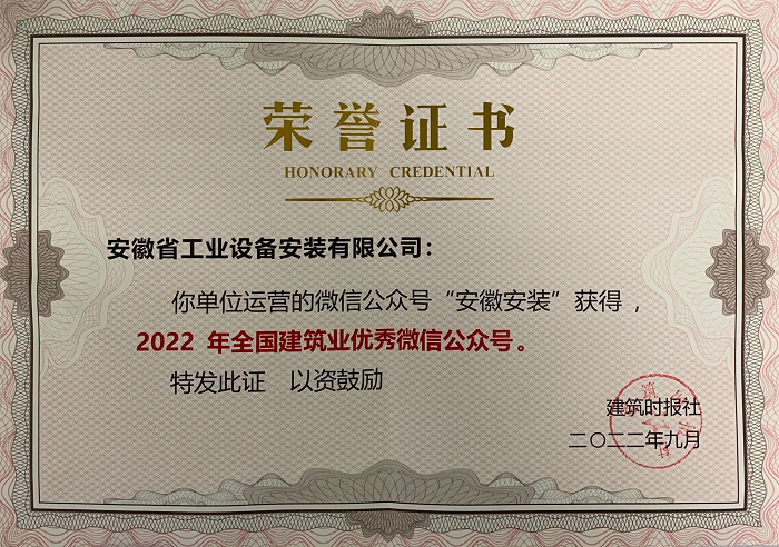 9月25日,由建筑時(shí)報(bào)社主辦的2022年建筑業(yè)微信公眾號(hào)運(yùn)維經(jīng)驗(yàn)交流研討會(huì)暨全國建筑業(yè)優(yōu)秀微信公眾號(hào)頒獎(jiǎng)典禮在武漢召開。公司微信公眾號(hào)“安徽安裝”榮獲“2022年全國建筑業(yè)優(yōu)秀微信公眾號(hào)”榮譽(yù)。