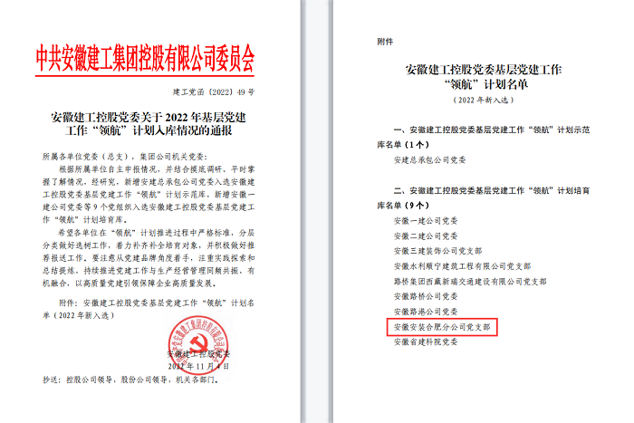 經(jīng)過(guò)前期充分準(zhǔn)備以及集團(tuán)嚴(yán)格篩選研究,安徽安裝合肥分公司黨支部于近日成功入選集團(tuán)基層黨建工作“領(lǐng)航”計(jì)劃培育庫(kù)。下一步,合肥分公司黨支部將以此為契機(jī),注重實(shí)踐探索和總結(jié)提煉,大力開展黨建品牌建設(shè),并充分發(fā)揮榜樣示范作用,帶動(dòng)更多的黨支部能有機(jī)會(huì)入選“領(lǐng)航”計(jì)劃培育庫(kù),持續(xù)推進(jìn)公司黨建工作與生產(chǎn)經(jīng)營(yíng)管理同頻共振、有機(jī)融合,以高質(zhì)量黨建引領(lǐng)保障企業(yè)高質(zhì)量發(fā)展。