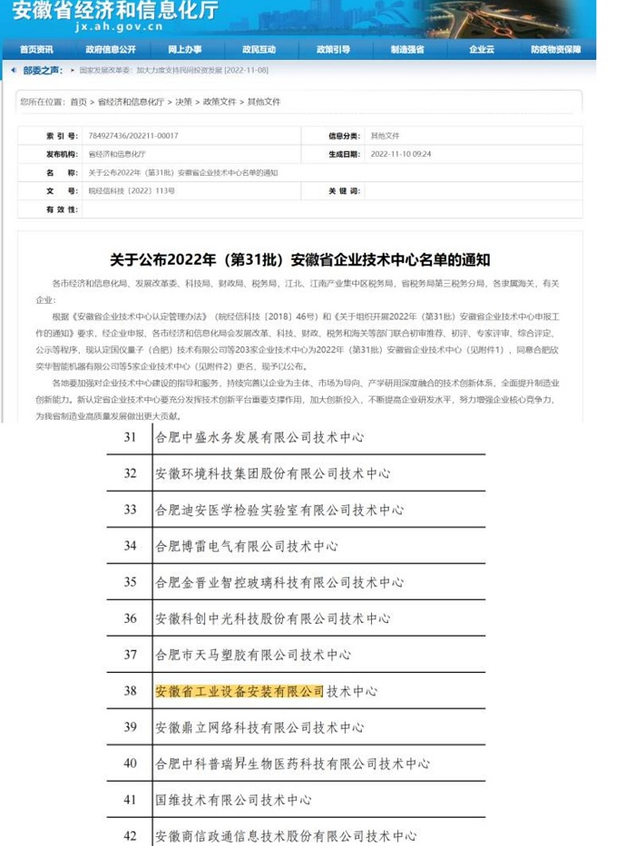 近期,經(jīng)企業(yè)申報(bào),各市經(jīng)濟(jì)和信息化局、發(fā)展改革委、科技局、財(cái)政局、稅務(wù)局和海關(guān)等部門(mén)聯(lián)合初審?fù)扑]、初評(píng)、專(zhuān)家評(píng)審、綜合評(píng)定、公示等程序,安徽省工業(yè)設(shè)備安裝有限公司技術(shù)中心順利通過(guò)“安徽省省級(jí)企業(yè)技術(shù)中心”認(rèn)定。