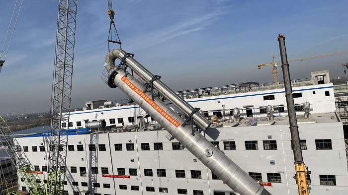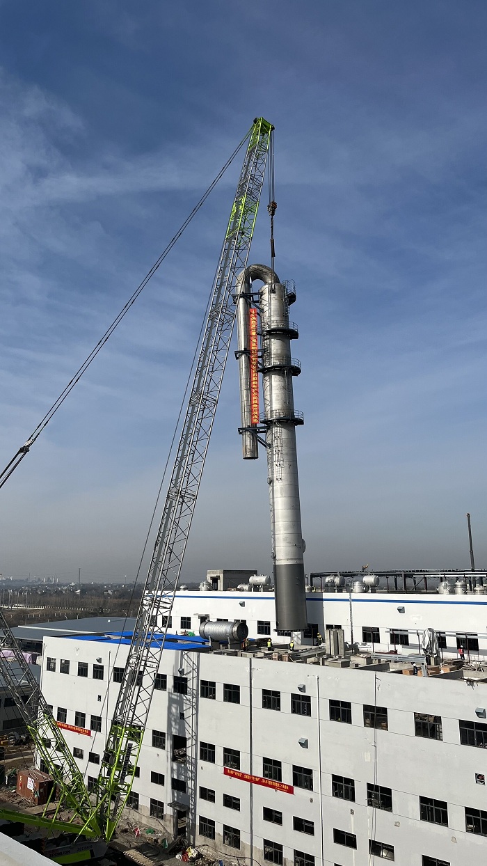 12月20日上午,安徽安裝合肥分公司承攬的蕪湖普立思生物科技有限公司聚乳酸及公用工程安裝項(xiàng)目丙交酯車(chē)間精餾塔一次性吊裝成功。