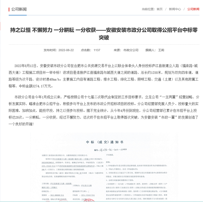 開拓市場取得突破。今年以來,分公司積極采取參與集團內(nèi)部產(chǎn)業(yè)鏈專業(yè)分包競標(biāo)和外部公招項目投標(biāo)雙向并舉的方式拓展市場,打開經(jīng)營局面,連續(xù)承接了蜀山區(qū)體育公園項目安裝工程等多個項目。同時積極參與合肥市公招平臺投標(biāo),8月份一舉中標(biāo)廬江縣新建立人路(福泉路-城西大道)工程施工項目,中標(biāo)金額3274.17萬元,取得公招投標(biāo)零的突破。