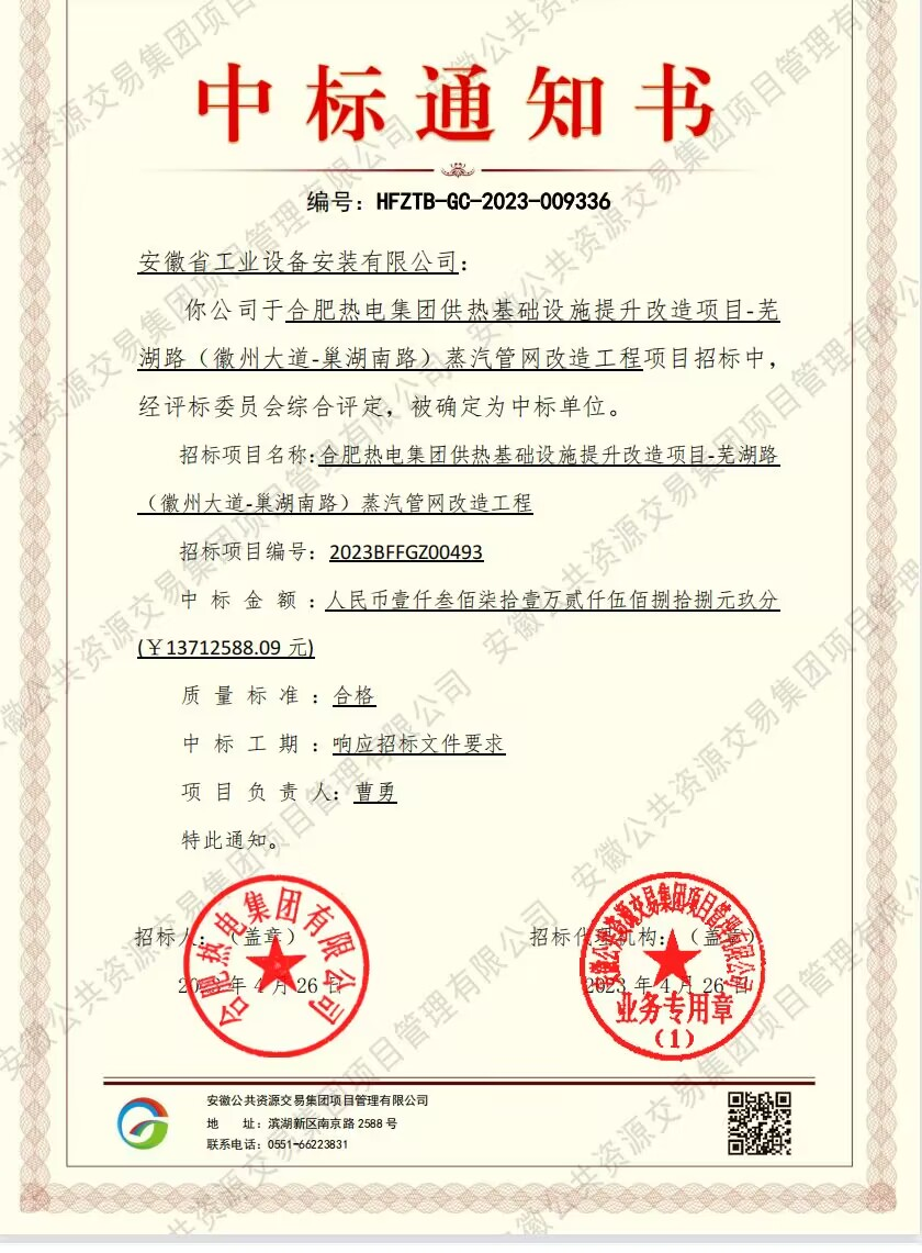 近日,安徽安裝市政分公司收到安徽公共資源交易平臺發(fā)來的中標(biāo)通知書,成功中標(biāo)合肥熱電集團(tuán)供熱基礎(chǔ)設(shè)施提升改造項(xiàng)目-蕪湖路(徽州大道-巢湖南路)蒸汽管網(wǎng)改造工程,中標(biāo)金額1371.25萬元。