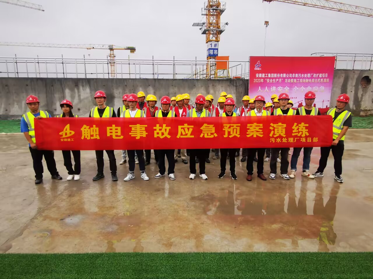 為提高員工應(yīng)對突發(fā)事故的應(yīng)急能力,檢驗(yàn)應(yīng)急預(yù)案的可行性,切實(shí)落實(shí)“安全第一、預(yù)防為主、綜合治理”的安全生產(chǎn)方針。6月18日上午,房建(裝飾)分公司聯(lián)合電梯分公司在阜南污水處理廠項(xiàng)目部組織開展觸電事故應(yīng)急演練。房建分公司和電梯分公司領(lǐng)導(dǎo)班子成員及分公司職能部門、項(xiàng)目全體成員參加本次演練活動(dòng)。