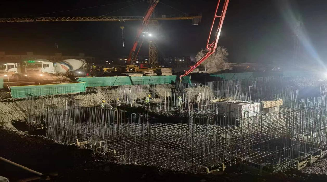 為了項目能如期完工,項目部緊抓工程進度,采取“白加黑”施工方式,夜幕下的烏蘇南苑項目部施工現(xiàn)場依舊是燈火通明,機器轟鳴,一片忙碌景象。