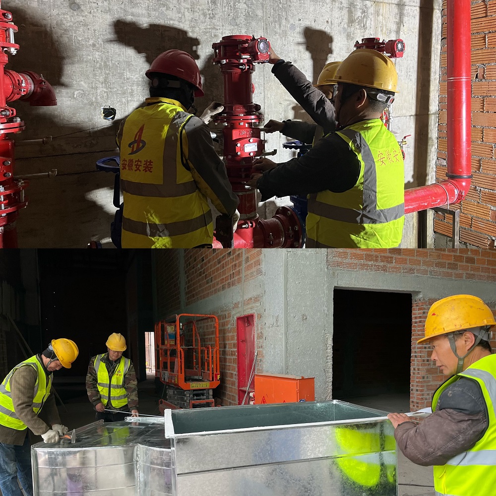 圖為:岳西中學建設(shè)項目(一期)安裝專業(yè)分包工程項目正在進行地下室濕式報警閥安裝、體育館風管加工