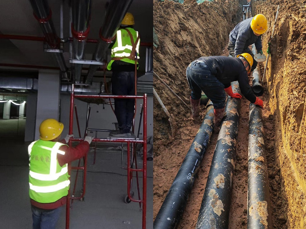 圖為:合肥高鐵路初中及高鐵路小學項目正在進行室內(nèi)消防管道安裝,室外給水管網(wǎng)施工