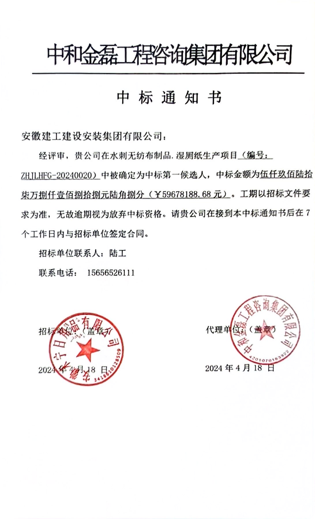 再傳喜訊!建工安裝蚌埠分公司中標(biāo)安徽禾寧日用品有限公司水刺無紡布制品廠房建設(shè)項目,合計中標(biāo)金額5968萬元。