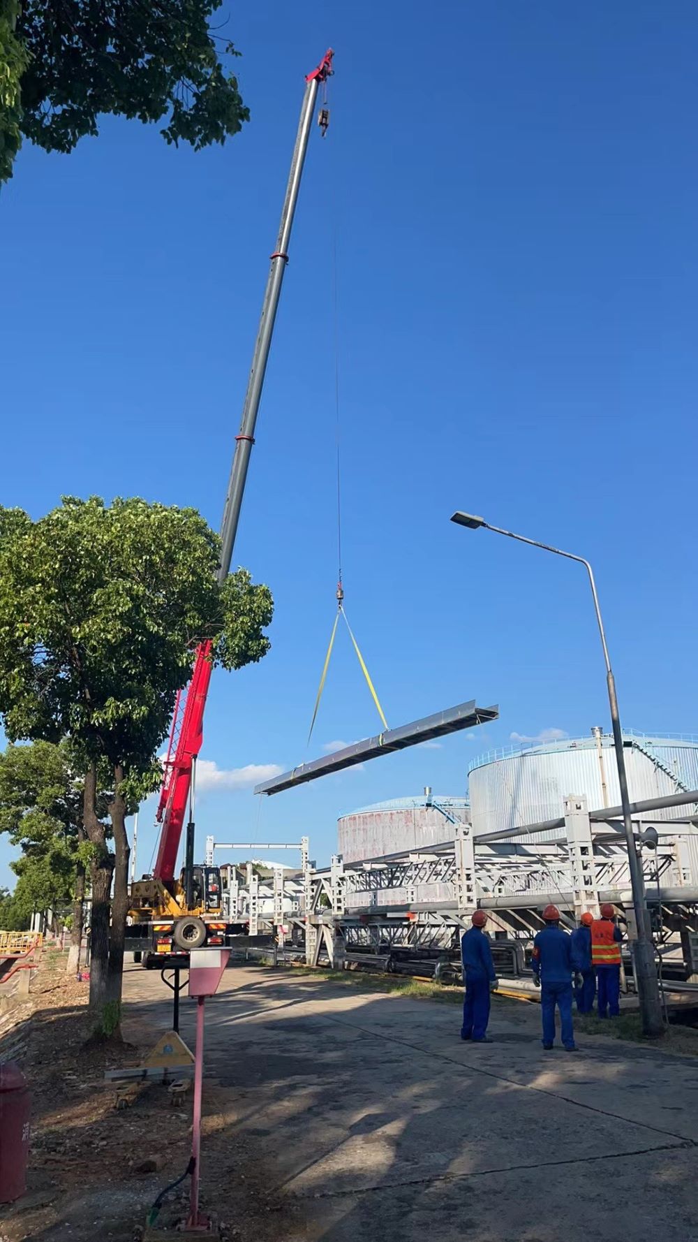 8月1日,該項目進(jìn)行電纜槽盒托架吊裝工作,該電纜槽盒托架采用18米每段進(jìn)行吊裝,先集中預(yù)制后到現(xiàn)場管廊處進(jìn)行對接后在吊裝至管廊上。該托架重量約0.6噸,使用1臺25噸吊車,將整段托架吊至上方,并對接安裝連接成一個整體。在項目部全體人員的共同努力下托架順利吊裝到位,該托架吊裝完成標(biāo)志著此項目安裝工作進(jìn)入尾聲,為項目按時完工奠定了良好的基礎(chǔ),目前正在進(jìn)行電纜橋架吊裝和電纜鋪設(shè)工作。