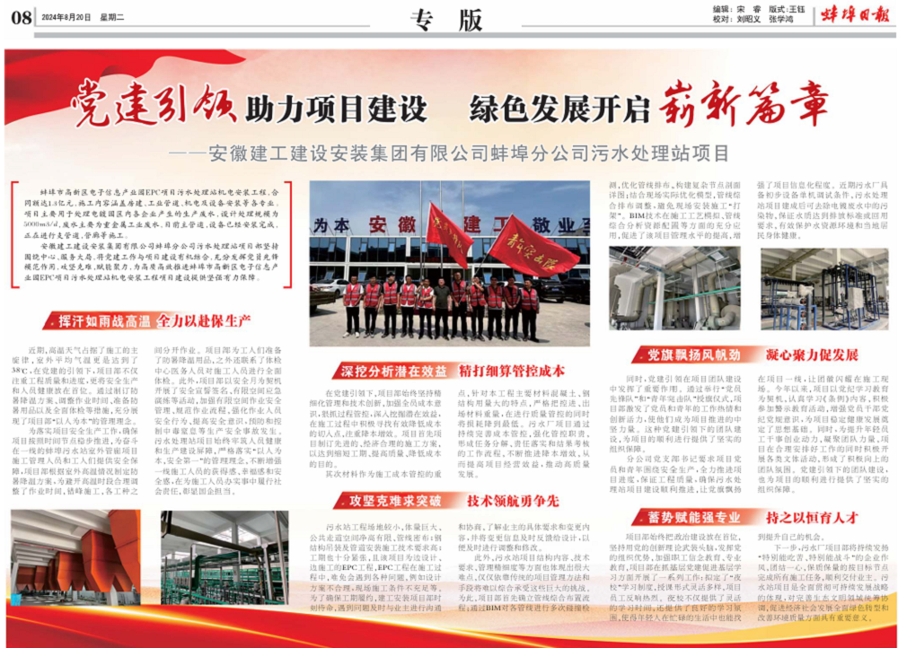 媒體專版報道了建工安裝蚌埠分公司高新區(qū)電子信息產業(yè)園EPC項目污水處理站機電安裝工程項目的基本概況,以及該項目抓黨建、保生產、降成本、強技術、育人才等方面的成功經驗和做法。