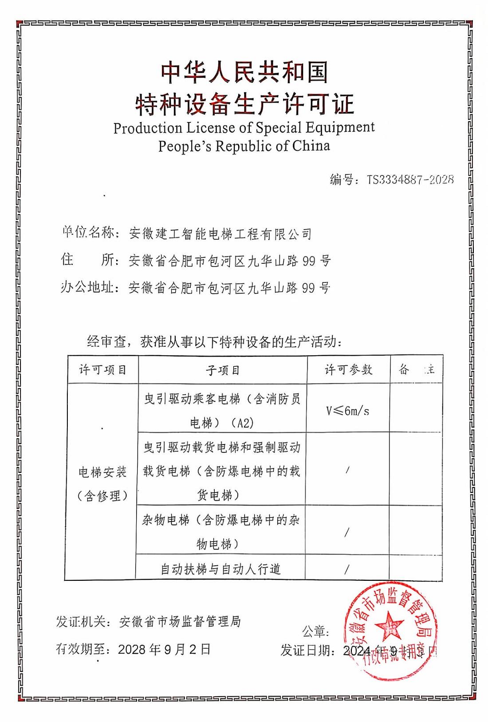 近日,經安徽省市場監(jiān)督管理局核準,安徽建工智能電梯工程有限公司順利取得特種設備生產許可證,喜獲電梯安裝(含修理)A2級資質。