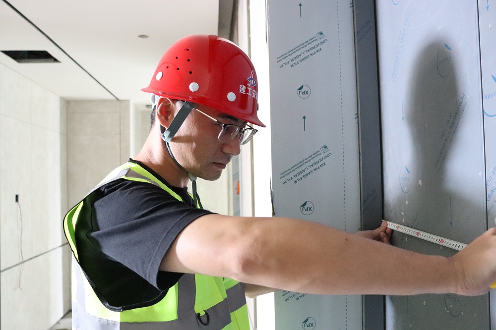 肥西縣鄉(xiāng)村文化旅游配套提升項(xiàng)目,技術(shù)負(fù)責(zé)人,湯楊,正在核查廳門安裝精度。丈量每一寸,精準(zhǔn)每一毫,奮楫篤行,臻于至善,一路走來淌下的汗水,是對工作的熱愛與堅(jiān)守。我在項(xiàng)目堅(jiān)守,我為祖國慶生。