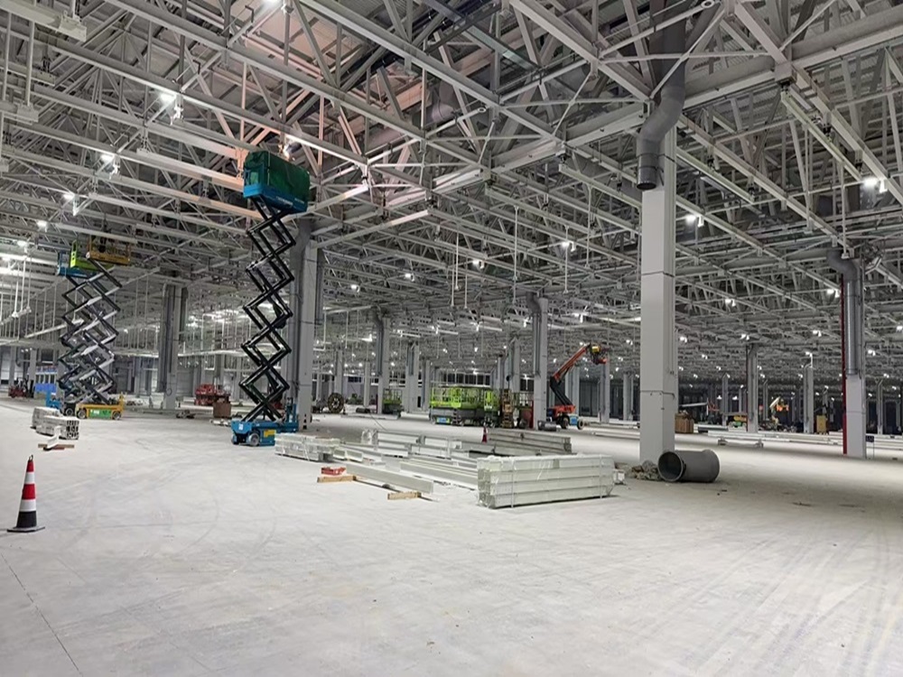 截至目前,車間一B區(qū)焊裝車間內(nèi)的給排水管道、消防管道、暖通風(fēng)管、空調(diào)水管、虹吸雨水、630循環(huán)水管均全部安裝完成,已全面進(jìn)入試壓階段。正在進(jìn)行車間一沖壓車間及QA樓安裝工作,電氣系統(tǒng)進(jìn)入電纜放線安裝階段,暖通系統(tǒng)進(jìn)入風(fēng)口風(fēng)閥安裝階段。