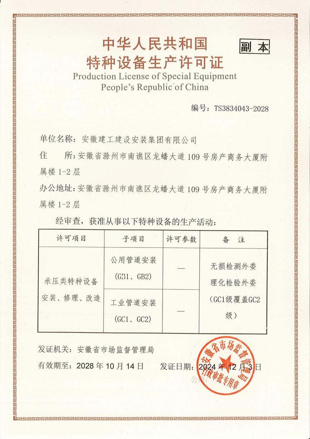 近日,建工安裝“承壓類特種設(shè)備安裝、修理、改造—壓力管道(GB1、GB2)、(GC1、GC2)”延續(xù)換證工作順利通過(guò)中國(guó)工業(yè)氣體工業(yè)協(xié)會(huì)、安徽省特種設(shè)備檢測(cè)院等各方的評(píng)審核查,現(xiàn)已取得安徽省市場(chǎng)監(jiān)督管理局頒發(fā)的新證,為公司相關(guān)業(yè)務(wù)的開(kāi)展奠定了良好基礎(chǔ)。