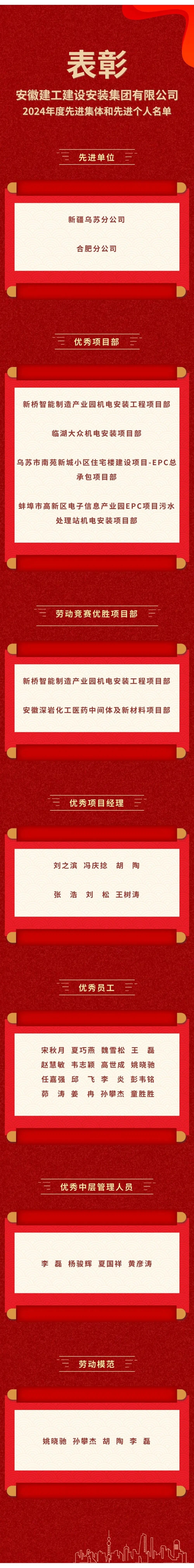 2月24日至26日,安徽建工建設(shè)安裝集團(tuán)有限公司十七屆五次職工大會(huì)暨2025年工作會(huì)議在滁州召開。會(huì)議期間,對(duì)2024年度先進(jìn)集體和個(gè)人進(jìn)行了表彰,激勵(lì)全體員工向先進(jìn)看齊、向榜樣學(xué)習(xí),為公司發(fā)展貢獻(xiàn)更大力量。公司領(lǐng)導(dǎo)班子出席會(huì)議并為受表彰集體、個(gè)人頒獎(jiǎng),部分受表彰先進(jìn)單位和個(gè)人代表結(jié)合工作實(shí)際作了交流發(fā)言。