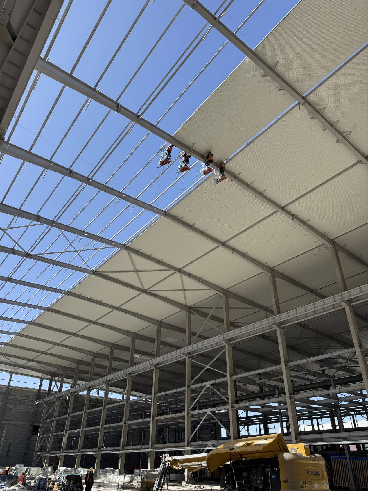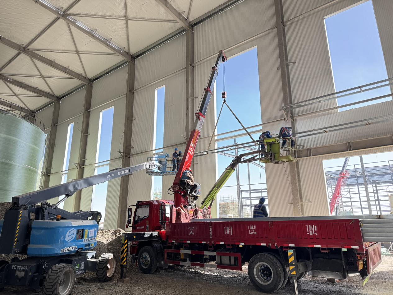 項(xiàng)目地處高海拔鹽湖區(qū),缺氧且淡水匱乏,施工環(huán)境惡劣,資源保障困難。面對不利因素,項(xiàng)目團(tuán)隊(duì)迎難而上,積極尋找解決方案,為項(xiàng)目順利推進(jìn)筑牢基礎(chǔ)。截至目前,項(xiàng)目已取得顯著階段性成果,廠房主鋼構(gòu)全部完成,管廊鋼結(jié)構(gòu)完成約95%,防火涂料完成80%,屋面及墻面圍護(hù)結(jié)構(gòu)完成約50%,配電房裝飾裝修工作有序進(jìn)行,各項(xiàng)任務(wù)按計劃穩(wěn)步推進(jìn)。